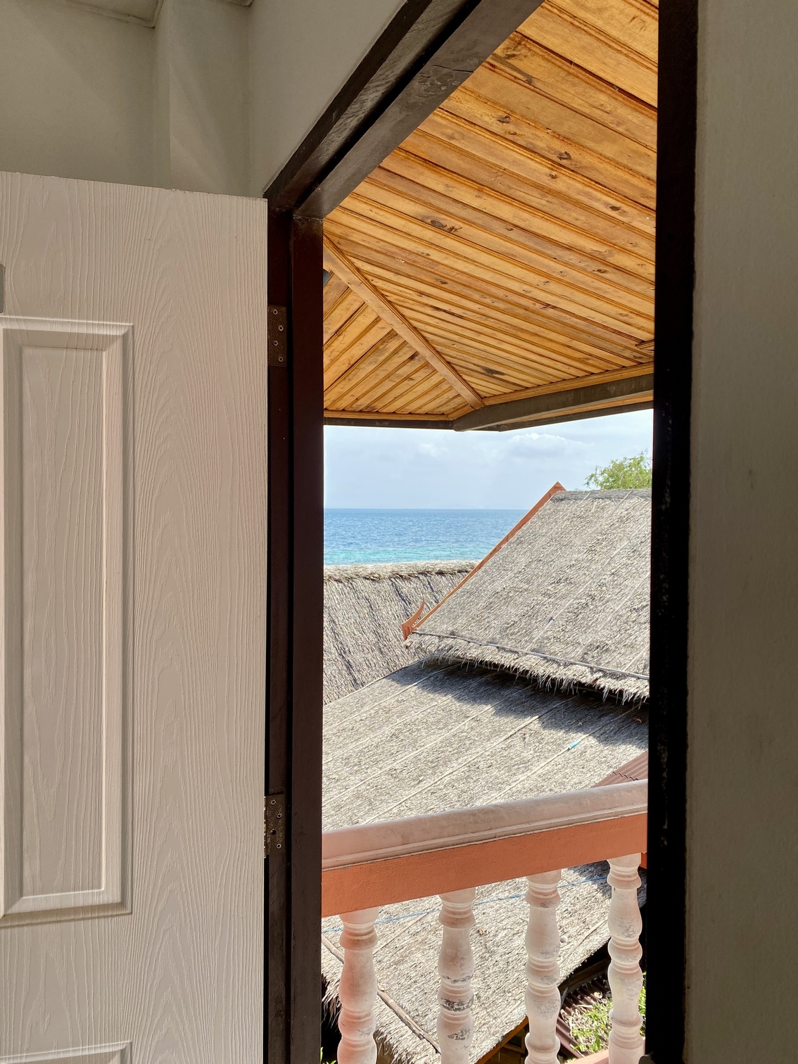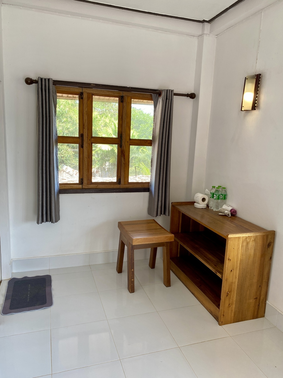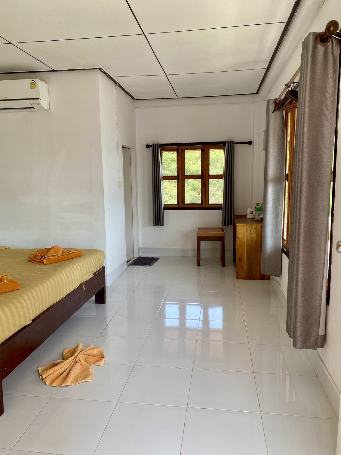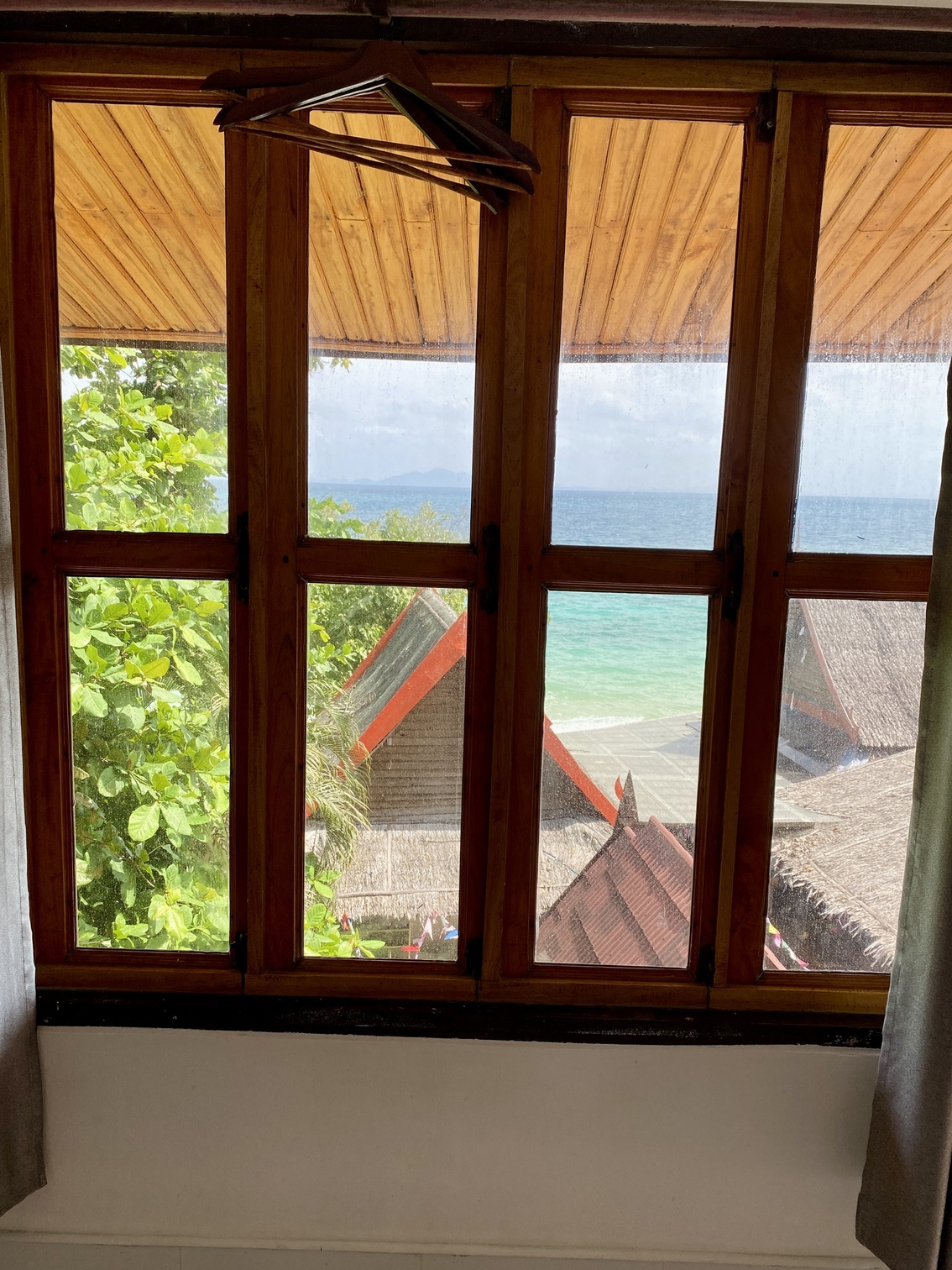 Large wooden-framed windows allow ample natural light and provide refreshing garden views, while select angles offer partial sea visibility. The room is air-conditioned and finished with clean tiled flooring, creating a cool and airy atmosphere ideal for tropical climates.
